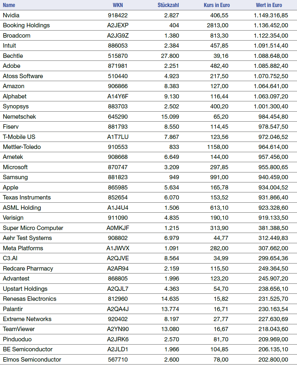 Die 35 größten Positionen des boerse.de-Technologiefonds